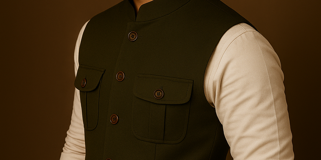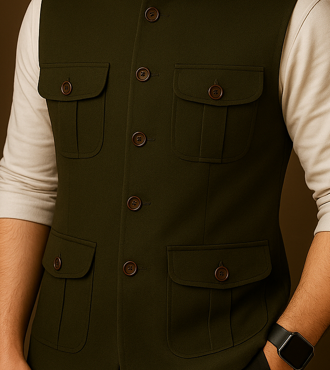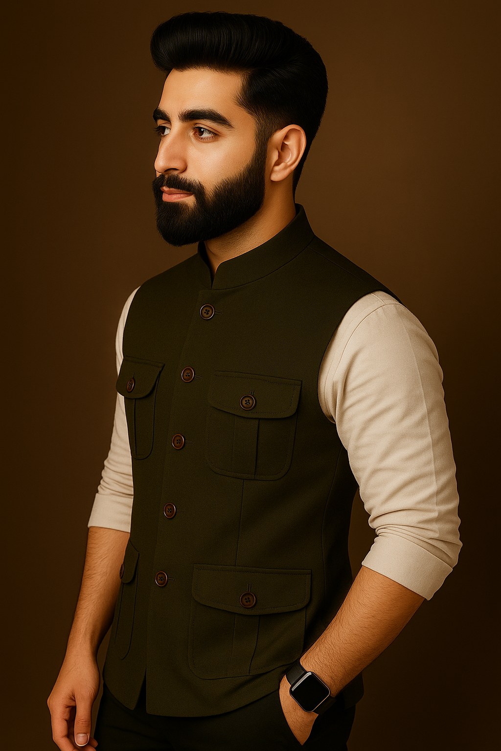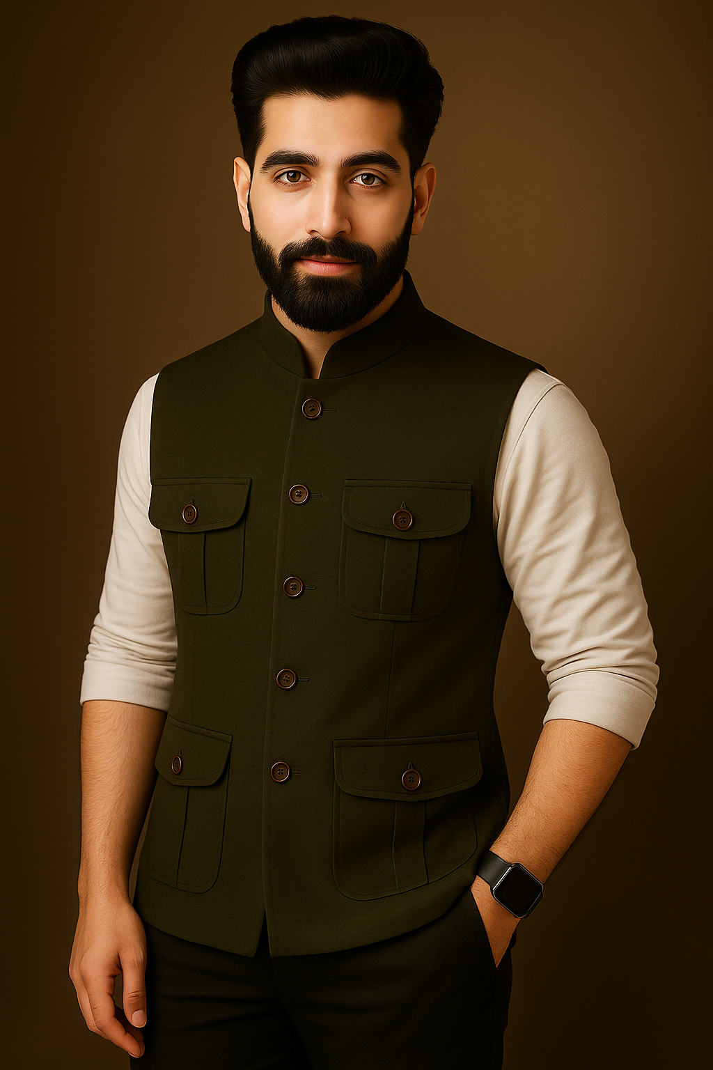 Premium Olive Green 4-Pocket Nehru Jacket for Men | Ethnic & Formal Wear – Vardaan Collections